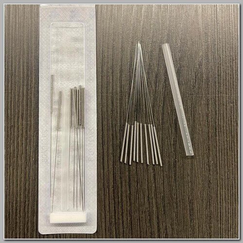 - Embaladas individualmente, com um mandril de plástico para cada agulha.