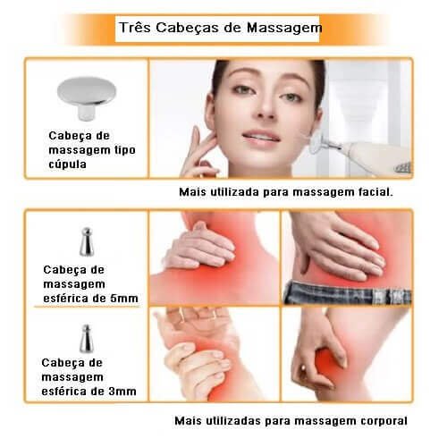 - Cabeças de Massagem Esféricas (3mm e 5mm): Perfeitas para massagem corporal, alcançando áreas como pulsos, cotovelos, tornozelos, pescoço, cintura e outras partes do corpo que possuam pontos de acupuntura.