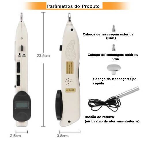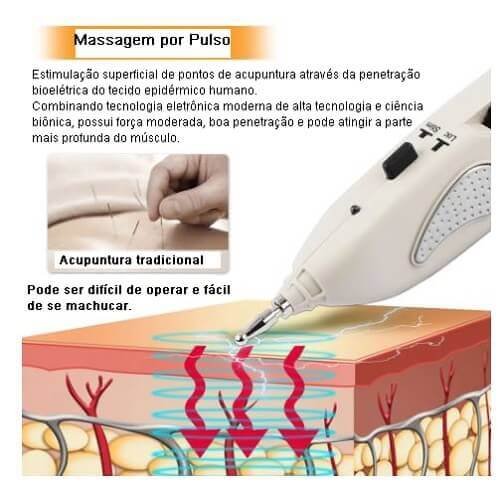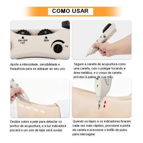 - Como funciona? É simples! Enquanto você desliza a caneta sobre a pele, o aparelho detecta os pontos de acupuntura com precisão. Uma tela de exibição digital mostra
