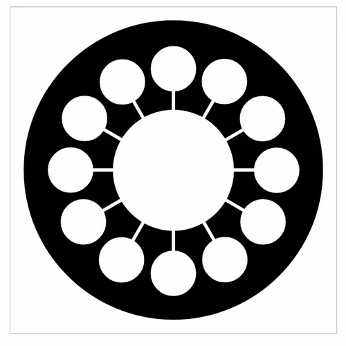 Gráfico composto por um Círculo Central dividido em Preto e Branco, de onde partem 12 Raios lineares que terminam em Pequenos Círculos periféricos. Esta geometria atua como um sintonizador de polaridades (centro) que amplifica e projeta intenções através de seus 12 vetores, conectando o pedido às forças universais.